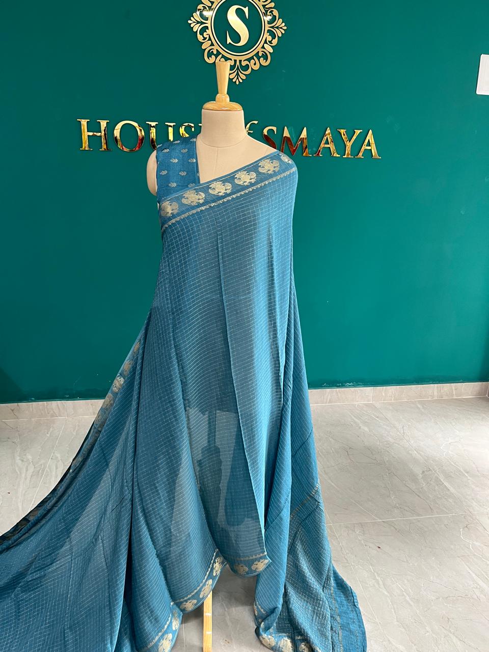 Embrace tranquil elegance with this exquisite teal saree from House of Smaya.