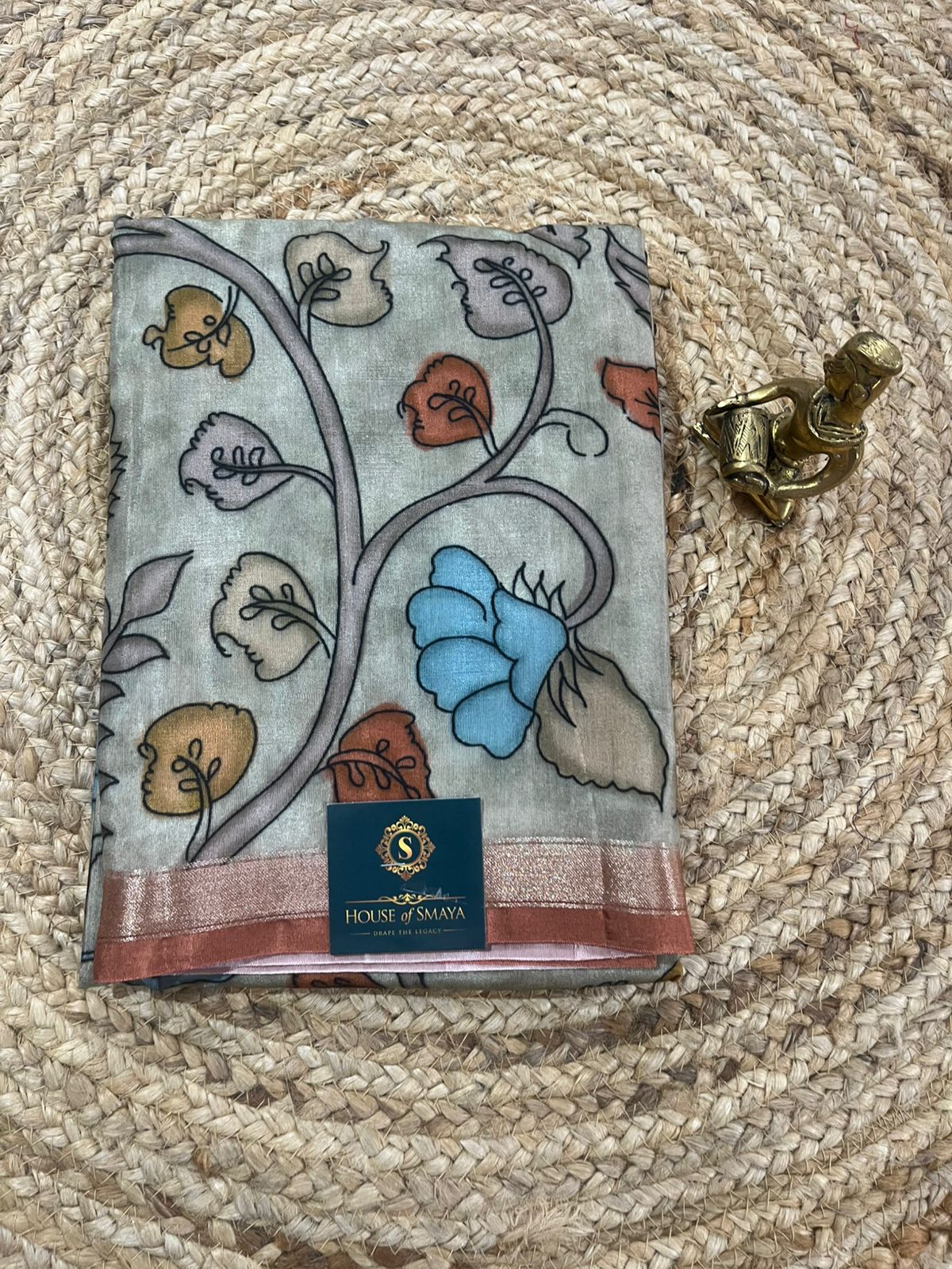 Bring home the charm of traditional artistry with this elegant Viscose Kalamkari Saree, designed for women who love subtle luxury. Set on a soothing soft grey base, this saree features intricate Kalamkari-inspired floral and vine motifs in earthy tones, beautifully balanced with a refined contrast border.