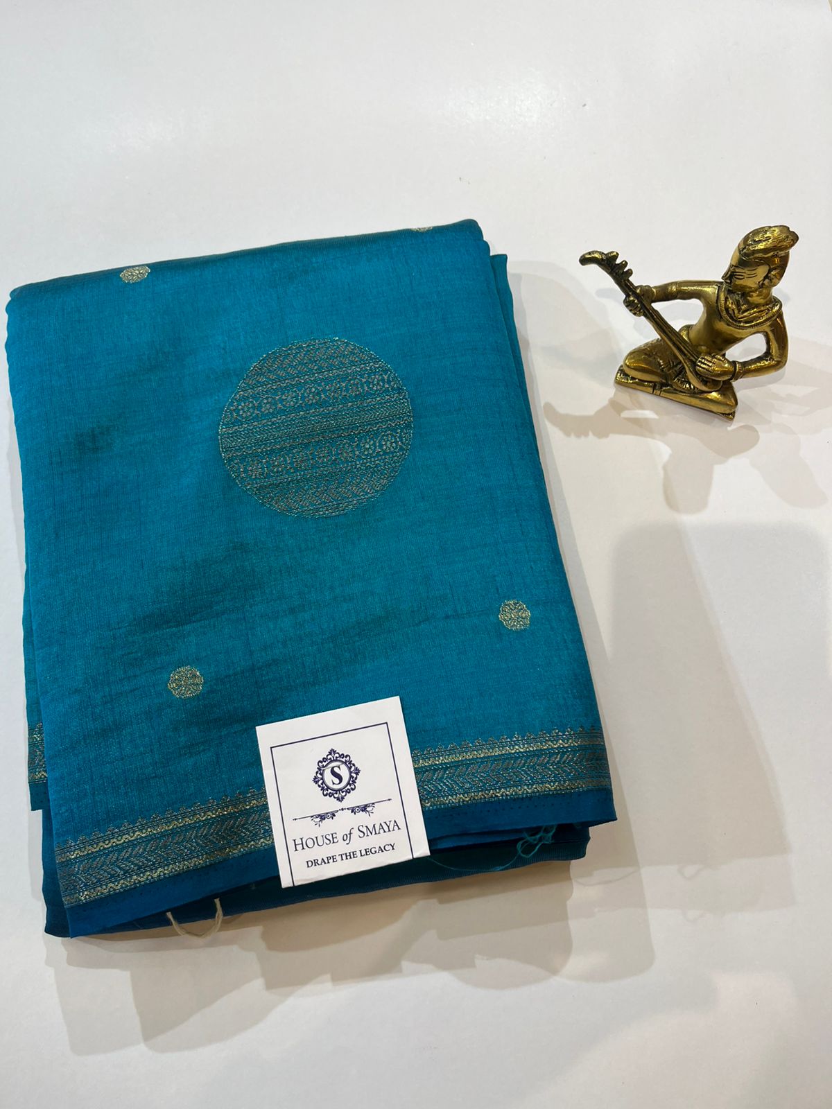 The serene teal blue base is beautifully enhanced with delicate gold zari buttas, including a statement circular motif that adds a touch of traditional charm. A subtle gold zari border completes the look, lending timeless elegance without overpowering the design.