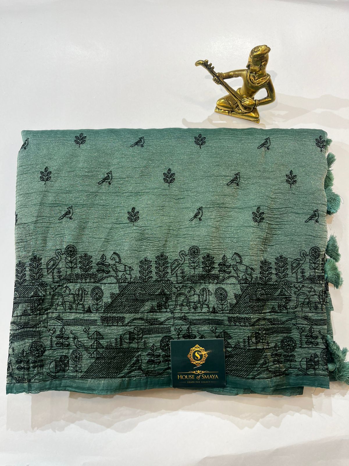 Teal Crush Organza Saree with Tribal Story Border
