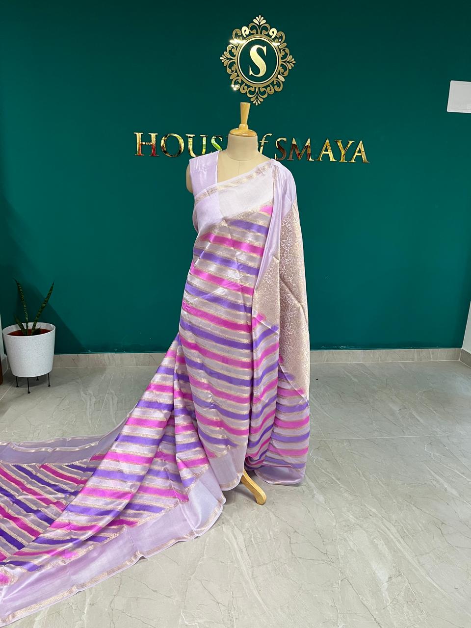Tissue Silk Lilac Saree with Golden & Pink Stripes