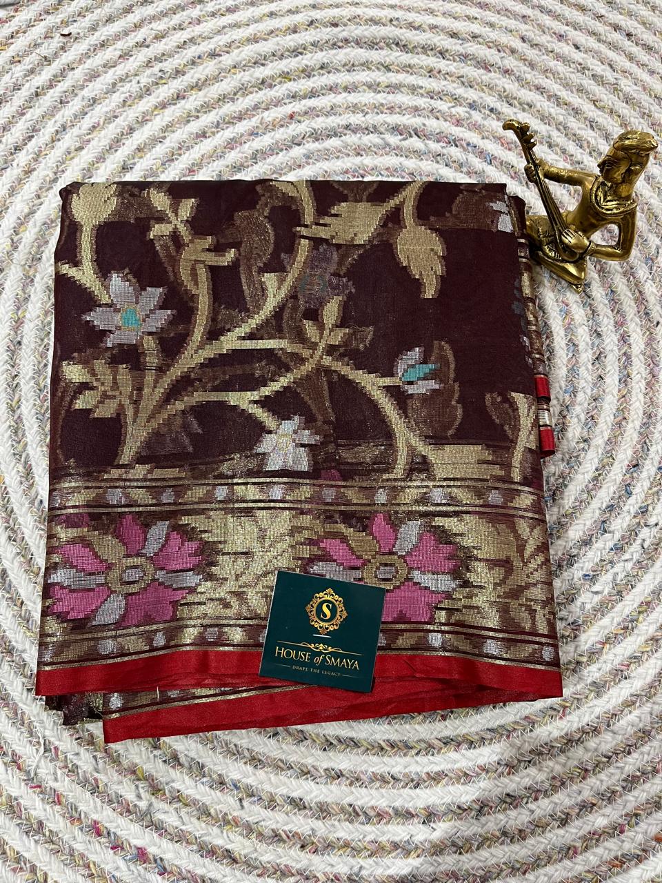 Wine & Gold Floral Semi Tissue Saree with Zari Border